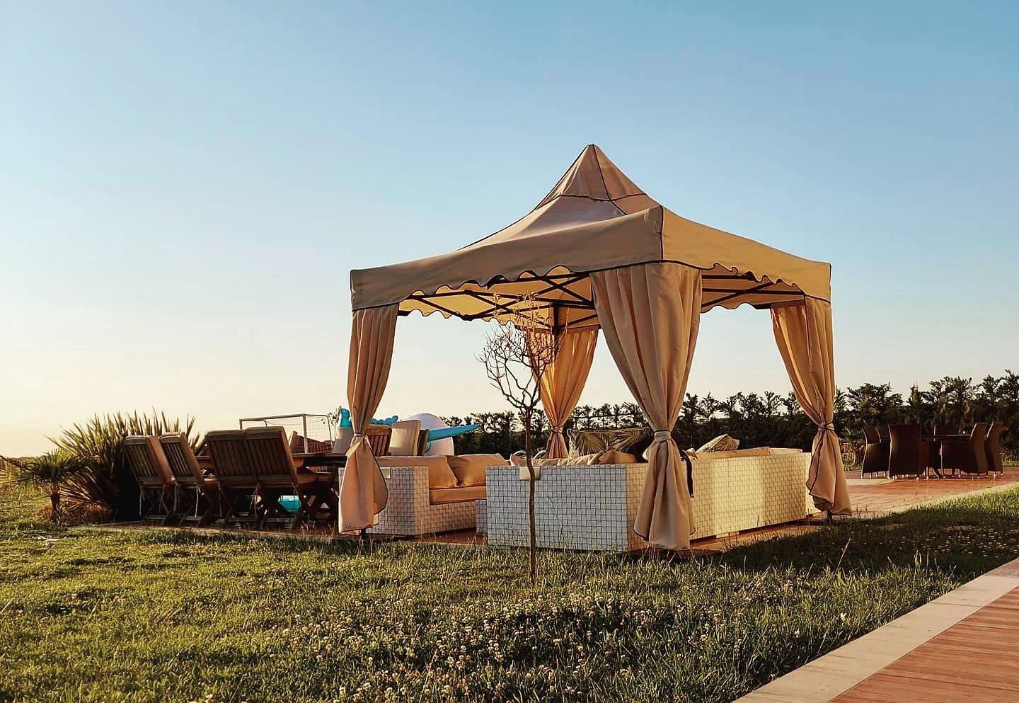 Ayrıca, çardağın çatısı, verimli hava sirkülasyonu sağlamak ve stabiliteyi artırmak için havalandırma delikleri ile donatılmıştır.